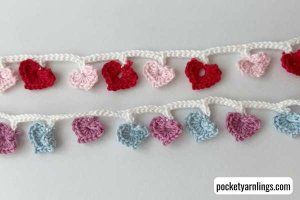 Try out this valentine garland crochet pattern from Pocket Yarnlings, perfect for using as decoration, or even as a headband or necklace. They whip up really fast in about 20 minutes and can be really cute presents to your loved ones!