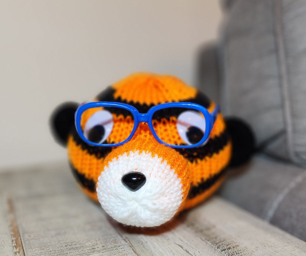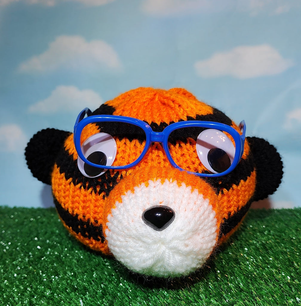 This adorable tiger will keep track of your glasses for you. Keep it on your end table or nightstand so you always know where you put your glasses. Tiger is machine knit and assembled by hand using acrylic yarn and polyester stuffing. Great gift for birthdays, Easter, Mother's Day or Christmas.